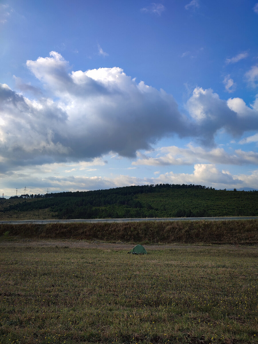 С вечера на небе собирались тучи но дождя так и не случилось. Палатка моя стояла в чистом поле у самой трассы, и солнце быстро дотянулось до нее своими жгучими щупальцами, пришлось встать раньше обычного и начать сборы. В Грузии много автострад и чтобы встать на стоянку а потом снова выйти на трассу, приходится перелазить через отбойники. Вообще дорогам стоит уделить немного отдельного внимания. Такого количества строящихся дорог я ещё в своих стенаниях не встречал. Дороги эти уникальны, в горах, по которым я ехал сегодня, они прошили землю гигантскими стежками. Когда путь им преграждают горы, они пронзают их насквозь глубокими тоннелями, когда долины и пропасти, они струной повисают в воздухе оставляя внизу целые села, реки и пастбища. Дороги эти строят китайцы, и кажется для этих парней нет ничего невозможного. В начале дня в один из тоннелей меня по предупреждению могли не пустить, и я заранее свернул на перекрытую старую дорогу, которая серпантином обвивает гору проткнутую