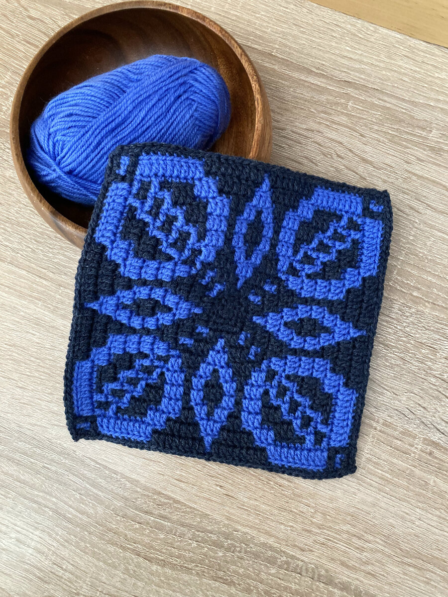 В продолжении двух предыдущих постов - составила схему и связала образец с таким же угловым элементом, только увеличила размер мотива до 20 рядов. Для этого немного изменила сам угловой элемент и добавила центральный элемент узора в виде ромба. Этот мотив, как и два предыдущих мотива, связан в технике мозаичного вязания крючком в одной из её разновидностей - в технике полного заполнения. Схема мотива "Очарование" И схема только с крестиками Начало вязания выполнила немного не по схеме (чтобы центр мотива был однотонным). Для этого первый ряд провязала тем же цветом, что и нулевой ряд (т. е. цветом фона), далее вязала по схеме. Вязала образец, как и предыдущий на 16 рядов, пряжей синих оттенков. До этого пробовала из этих цветов вязать обычную мозаику - не понравилось, тёмно-синий цвет "съедал" ярко-синий оттенок, мотив получался слишком тёмным. А при этой технике мозаичного вязания (полного заполнения) элементы узора получаются более выразительными и в целом мотив выглядит "очаровател