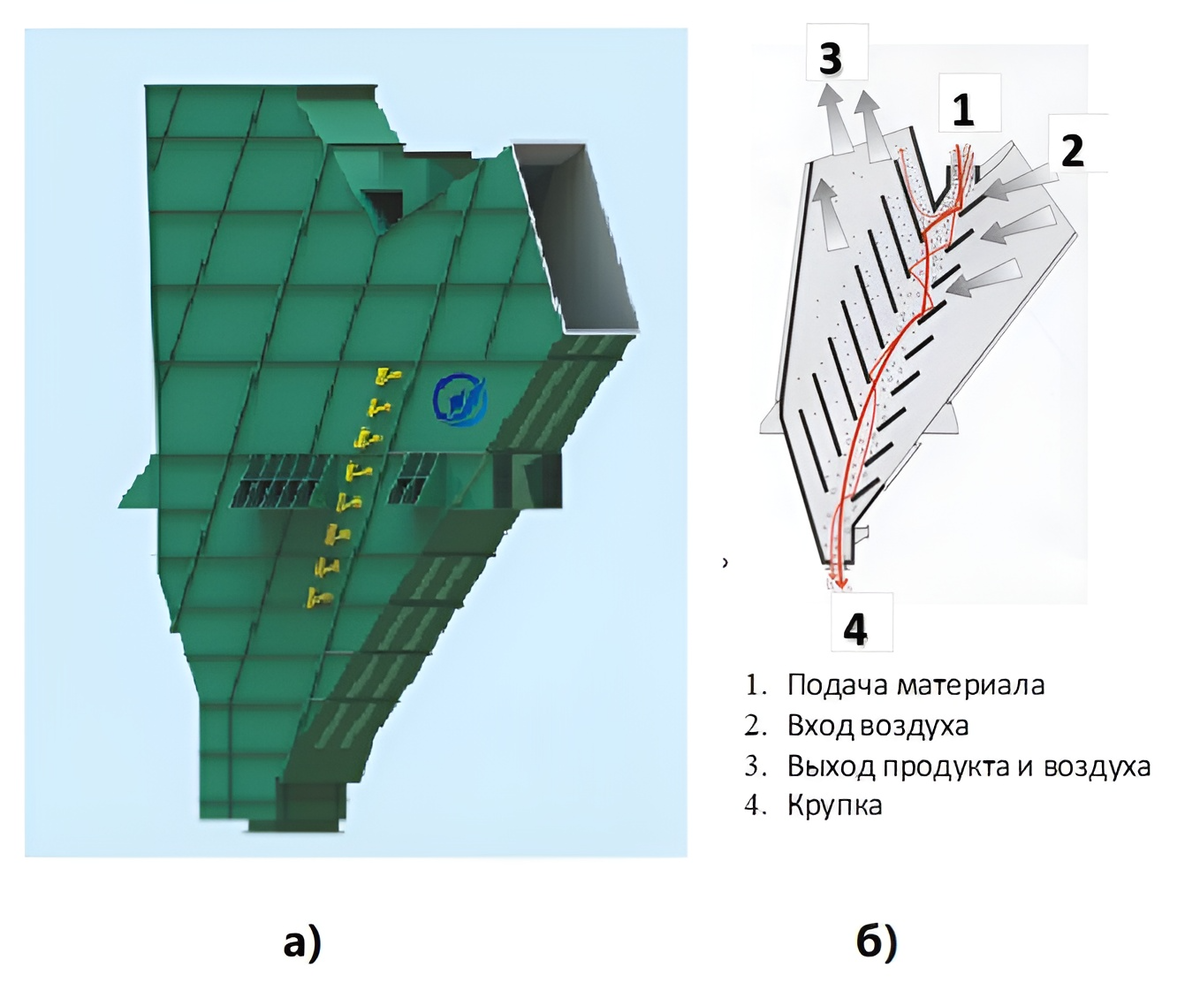 Питание V-сепаратора осуществляется сверху. Материальный поток проходит через зону сепарации по наклонным пластинам. Сепарирующий воздух поступает в зону сепарации поперек материального потока. Зона сепарации располагается между наклонными плитами и каскадом отбойных плит.