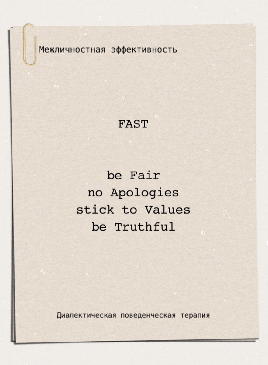Навык диалектической поведенческой терапии FAST, из группы навыков межличностной эффективности, в дополнение к навыку GIVE. Это акроним, который означает следующие четыре компонента: Fair, Don’t Over-Apologize, Stick to values и Truthful. Этот навык помогает поддерживать самоуважение и уверенность, устанавливать здоровые границы в отношениях с другими людьми и разрешать конфликты. Первый компонент «Fair» (Справедливость) означает, что необходимо учитывать свои собственные потребности и желания, а также потребности и желания других людей. Признавать и валидировать эти потребности, быть справедливым к себе и и другим. Задайте себе вопросы, что сейчас с вами, что может происходить с другим человеком, если эмоционально вы абсолютно не согласны, попробуйте сместить фокус, может ли быть иная точка зрения. Второй компонент «Don’t Over-Apologize» (Отказаться от избыточных извинений) не подразумевает, что нужно перестать извиняться когда бы то ни было. Речь об отказе от от автоматических, неиск