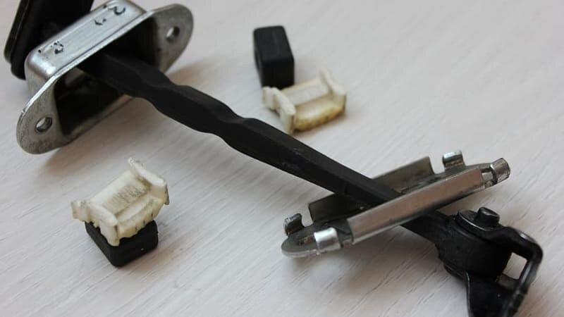 4️. На парковке открывать дверь нужно с особой аккуратностью. Ведь она может резко распахнуться из-за порыва ветра и поцарапать соседние машины. И вот обычная поездка на работу превратилась в квест: ждать владельца, вызывать ГАИ и выплачивать компенсацию за ремонт… А ведь проблема в износе всего двух деталей — фиксаторов в ограничителе дверей. Достаточно заменить изношенные фиксаторы на новые из ремкомплекта и проблема решена! В состав комплекта входит:
