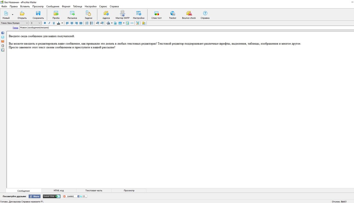 Это краткий обзор на программу и как с ней работать, детально разбирать каждую функцию в этой статье мы не будем, это занимает много времени и мы выпустим видео для тех кто хочет разобраться в ней полностью чуть позже. И так запускаем программу и перед Вами появляется это окно В этом окне в поле тема Вы пишите текст который увидит получатель письма у себя в почте. Чуть ниже вставляете или прям в нем пишите само сообщение письма.( что и как писать будет в отдельной статье) -Следующий шаг нажимаем в верхнем меню слово "сообщение" и выбираем "свойство сообщения" Заполняем поля имя, адрес и обратный адрес, после чего нажимаем кнопку "ок" ( остальные поля пока не трогаем их более детальный разбор можно будет увидеть в видео которое мы разместим позже на канале) -Следующий шаг нам нужно настроить smtp сервер для отправки сообщений, в верхнем меню нажимаем "Настройки" и в под вкладке выбираем "общие настройки" В появившемся окне выбираем вкладку "smtp" Выбираем метод отправки сообщений толь