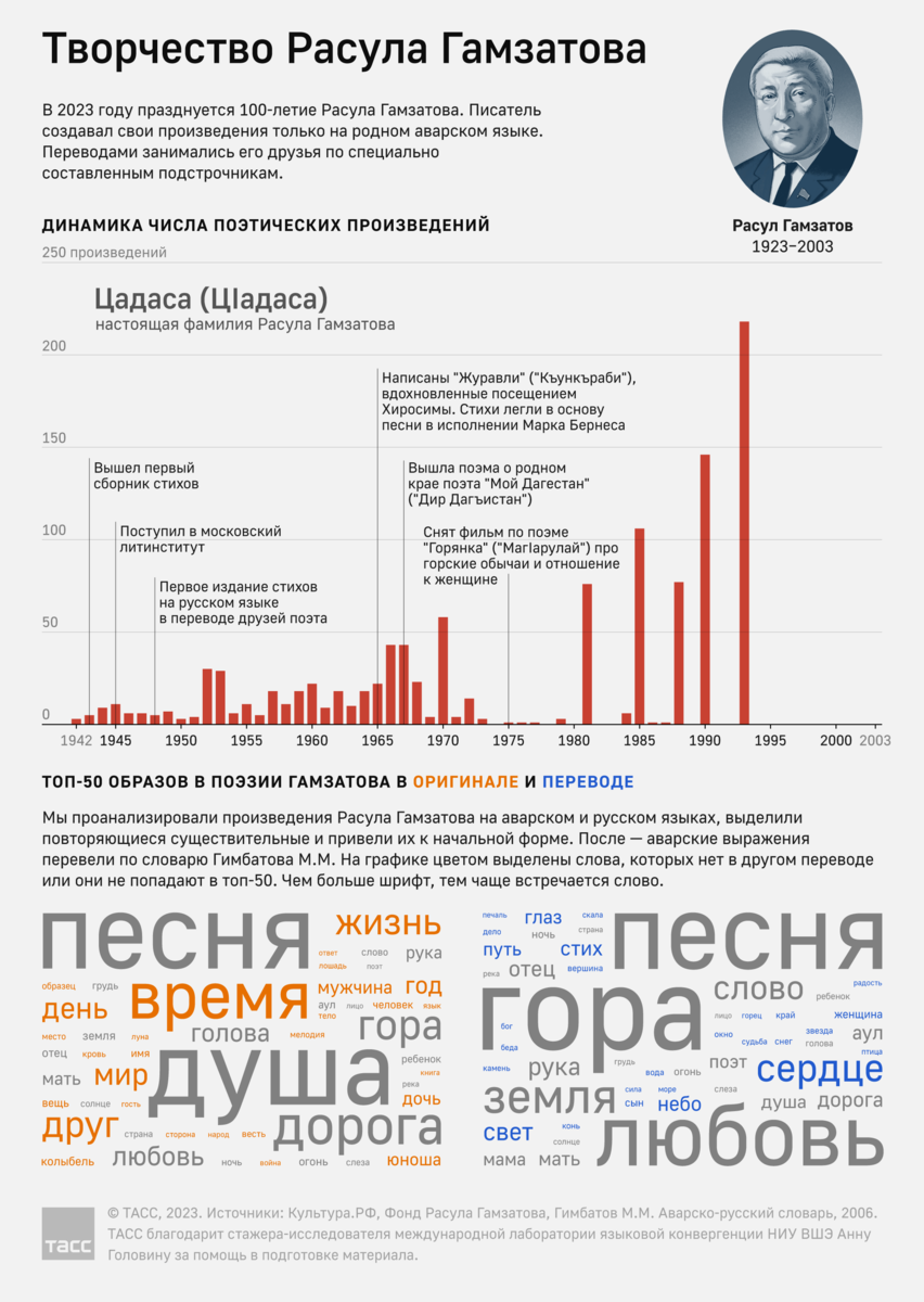 8 сентября празднуется 100-летие со дня рождения поэта и переводчика Расула Гамзатова. Настоящая фамилия Расула Гамзатова — Цадаса, псевдоним он взял от имени отца — поэта Гамзата Цадасы. Все произведения автор писал на родном аварском языке. Стихи Гамзатов начал писать в девять лет. В 1943 году, когда автору было 20 лет, вышел его первый поэтический сборник, а в 1948 году, после поступления в московский литинститут, опубликован первый сборник на русском языке в переводе друзей писателя. Гамзатов писал стихи о войне, на которой погибли его старшие братья, и о народе. В 1975 году вышел фильм по поэме "Горянка" про горские обычаи и отношение к женщине. Русскоязычной аудитории широко известно его произведение "Журавли", которое легло в основу одноименной песни в исполнении Марка Бернеса. Мы проанализировали тексты писателя на аварском и русском языках. Образы в оригинале и переводе отличаются, некоторые стихи на аварском так и не переведены на русский. В топ-50 образов на аварском языке в