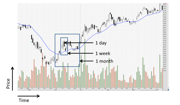 На валютном рынке существуют покупатели и продавцы. Сделка происходит, когда и покупатель и продавец соглашаются на конкретную цену. Поскольку количество покупателей и продавцов на рынке постоянно меняется, меняется спрос и предложение, что приводит к непрерывным изменениям цен. График цен - это просто визуальное представление всех сделок, которые происходят с определенным продуктом за определенный период времени. Изменение графика позволяет нам более легко изучать тенденции цен во времени. Существует разные виды графиков цен, такие как: линейные графики, графики Ренко, графики Каги и др., но наиболее распространенным графиком сегодня является свечной график, именно его мы будем использовать во всех наших примерах. На приведенном выше примере вы видите, что цены отображаются на вертикальной оси, а время - на горизонтальной оси. По мере того как мы смотрим на график слева направо, мы наблюдаем, как меняются цены во времени. Поскольку это ежедневный график, одна свеча представляет собой