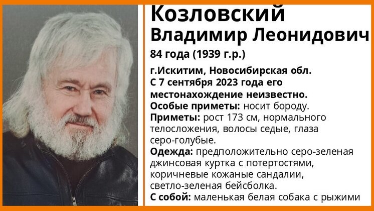 В городе Искитиме Новосибирской области без вести пропал 84-летний Владимир Козловский. С 7 сентября 2023 года его местонахождение неизвестно. Дедушку ищут сотрудники полиции и волонтеры поисково-спасательного отряда (ПСО) «ЛизаАлерт». Приметы пропавшего: рост 173 сантиметра, нормальное телосложение, волосы седые, глаза серо-голубые. В день исчезновения предположительно был одет в серо-зеленую джинсовую куртку с потертостями, коричневые кожаные сандалии, светло-зеленую бейсболку. Из отличительных черт – пенсионер носит бороду. Вместе с пожилым мужчиной пропала маленькая белая собака с рыжими пятнами. Если у вас есть информация о местонахождении Владимира Козловского и его питомца, сообщите об этом по телефону ПСО 8-800-700-54-52 или наберите 112. Ранее «Вести Новосибирск» рассказывали, как разыскивают 14-летнюю девочку из Республики Бурятия.