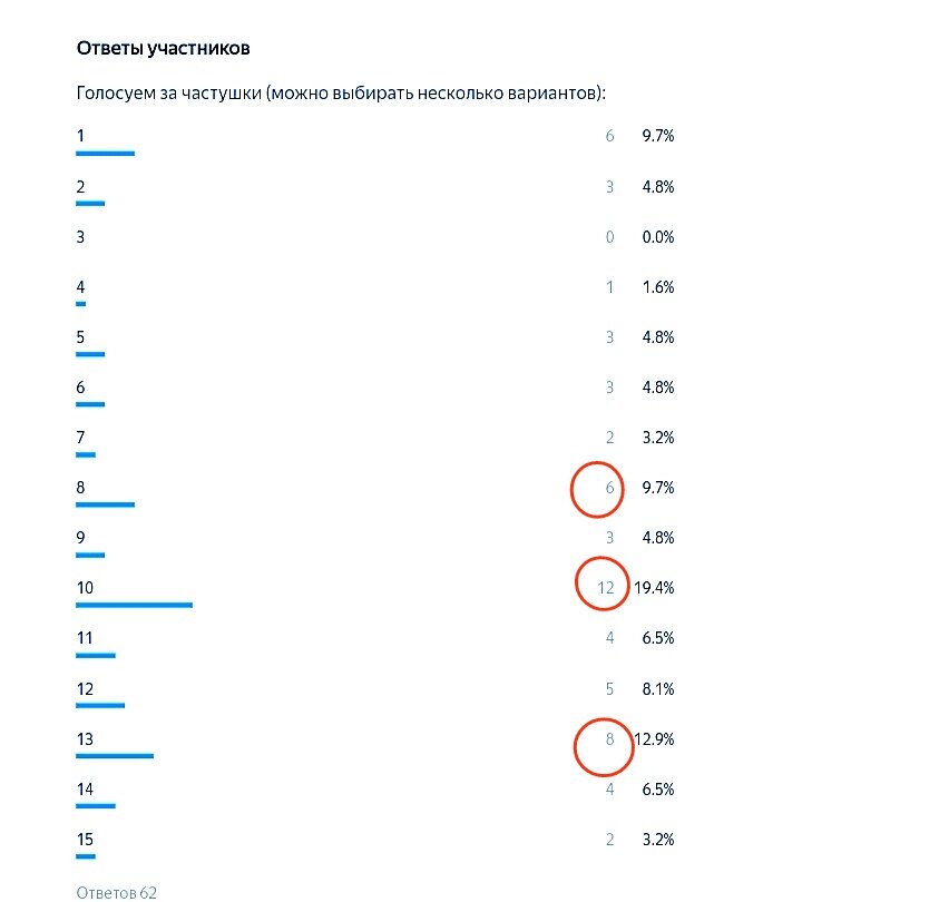 Должна извиниться за то, что так долго тяну с результатами по Конкурсу виноградных частушек, но, поверьте, были серьезные для этого причины. Наконец, могу объявить победителей, делаю это с большим удовольствием. На скриншоте ниже итоги голосования, которые совпали с мнением редакции канала и питомника. Цифра подчёркнутая синим - это номер частушек в списке претендентов на приз, красным кружком я выделила участников с наибольшим количеством отданных голосов. Чтобы совсем было все понятно, сообщаю, что места распределились следующим образом: 1 место достается сочинению под номером 10, которое получило максимум голосов; 2 место - частушка под номером 13 (8 голосов); 3 место - частушка под номером 8, за нее проголосовали 6 респондентов. Частушка под номером 1 выбывает из голосования, потому что не смотря на свой задор оказалась почти полной копией уже существующего образца народного творчества, причем скабрёзного содержания. Я, к сожалению , не знала о её существовании , поэтому включил