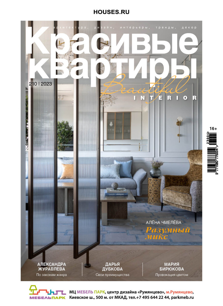 Публикация в журнале проекта, который создавался с любовью и вниманием - всегда приятна для дизайнера интерьера и команды. В журнале "Красивые Квартиры" наш интерьер украсил обложку издания, что еще приятнее, и мы очень городимся своей работой. В статье можно также узнать о взглядах руководителя Art Concept - Алены Чмелевой на современный дизайн, и о том, как создаются такие красивые пространства. Цитата. Обращение к специалисту — это не только залог реализации художественного образа, но и хорошая инвестиция… Несомненно. Занятому человеку некогда сравнивать десятки выкрасов, перебирать метры тканей. Мы же контролируем каждый этап — от закупки материалов до технического сопровождения, заказчику остается только утверждать работы. Если же говорить о моих предпочтениях, то я, безусловно, выберу натуральный камень, инженерную доску, постараюсь донести до заказчика, что потолок может быть светло-серым, молочным, нежно-бежевым, а не традиционно белым. Каждый интерьер — это портрет клиента,