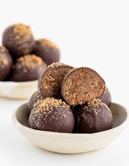 Эти шоколадные имбирные трюфели, также известные как пряничные шарики, представляют собой восхитительный праздничный десерт без выпечки, состоящий только из полезных и натуральных ингредиентов. Если возможно, при приготовлении десертов без выпечки лучше всего использовать мягкие финики сорта меджул. Если же вы не смогли найти именно эти финики, то замочите обычные на 10 минут в горячей воде. После слейте воду и обсушите финики бумажным полотенцем. Дальше действуйте по рецепту. Ингредиенты: Способ приготовления: 1. Смешайте в кухонном комбайне сырой миндаль, овсяные хлопья, молотую корицу, молотый имбирь и соль. Взбейте в рассыпчатую, похожую на муку смесь. 2. Добавьте в кухонный комбайн финики без косточек, воду и ванильный экстракт. Перерабатываем/пульсируем до получения липкой, похожей на тесто, консистенции. Тесто должно быть достаточно липким, чтобы его можно было сжимать руками. 3. Выстелите противень или столешницу пергаментной бумагой. Скатайте тесто в шарики диаметром около 3 с