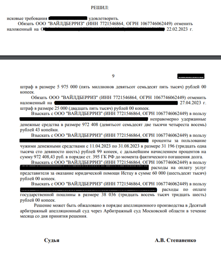 Таким образом итого Селлер оказался оштрафован на 6 000 000 рублей из которых ООО «Вайлдберриз» смогло удержать 972 408 (девятьсот семьдесят две тысячи четыреста восемь) рублей 43 копейки.