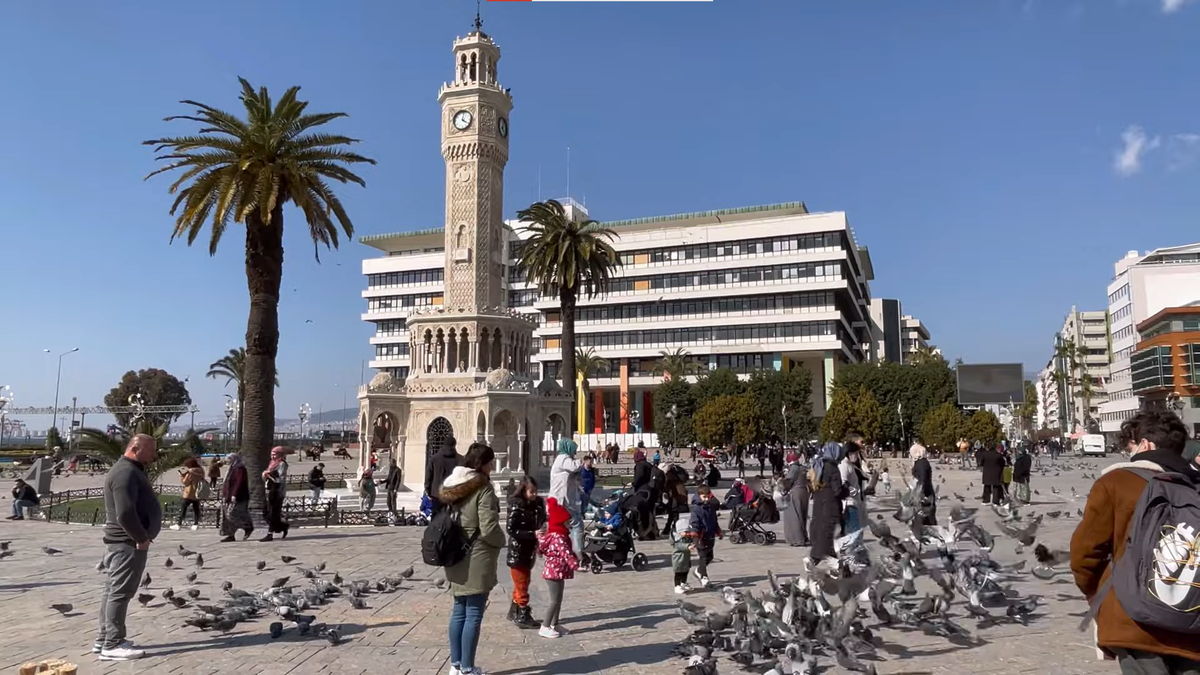 Мы направляемся к следующей остановке - площади Джумхуриет. Там находится статуя Ататюрка и множество высококлассных отелей, таких как Swissotel, Marriott, Hilton. Продолжаем идти по пляжу, и здесь мы видим главную достопримечательность - Часовую башню и площадь Конак. Это самая значимая достопримечательность в городе Измир.