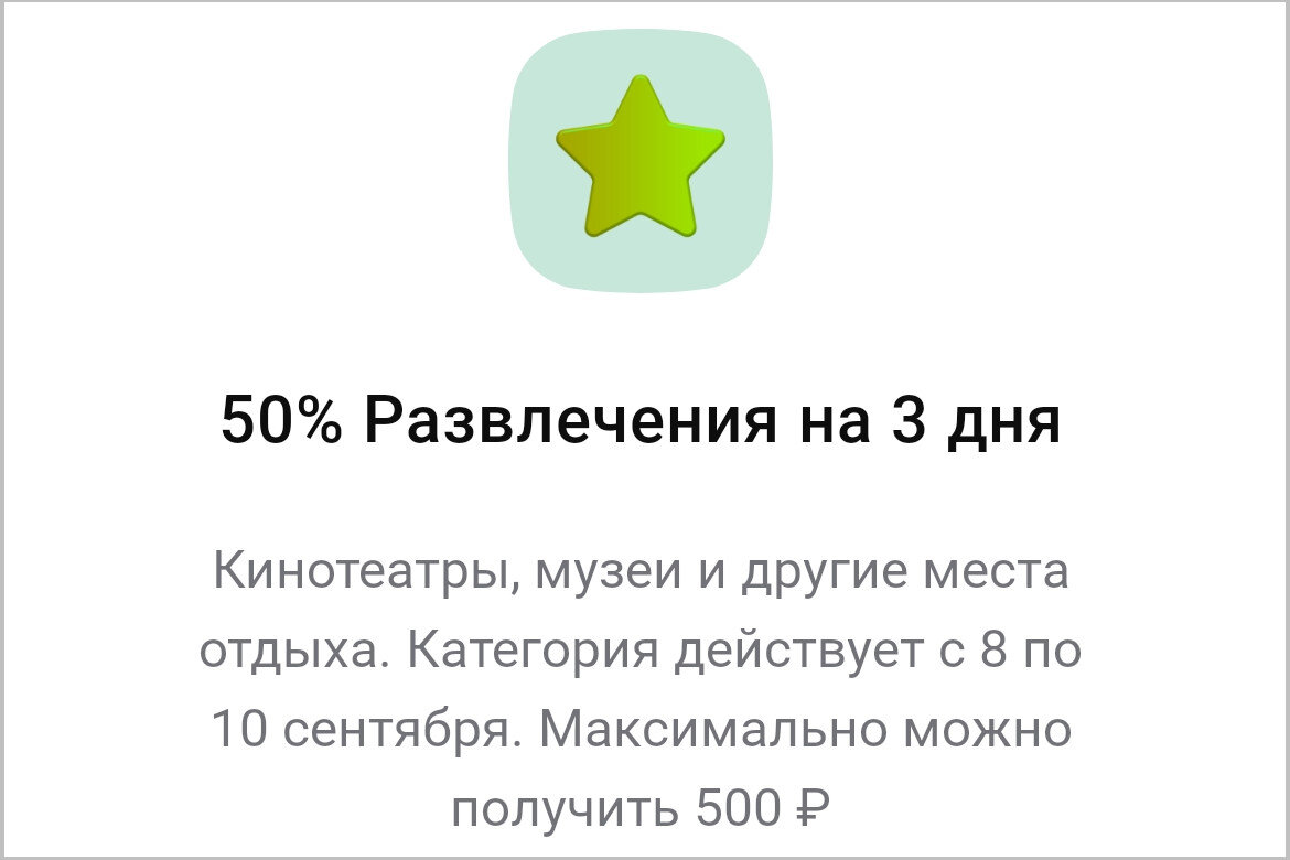 Кешбэк 50% на развлечения действует 8,9,10.09.2023 (сегодня и в выходные). Максимально можно получить 500 рублей, соответственно потратить для этого нужно 1000 рублей. Для того, чтобы он работал, должны быть выбраны категории кешбэка на сентябрь.