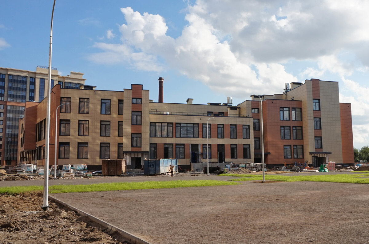 Сейчас в здании смонтированы кровля и окна, фасад отделан навесными керамогранитными плитами, ведется монтаж вентиляции, электрики, сантехники, слаботочных систем. В ближайшее время на территории создадут прогулочные и спортивные площадки, беговые дорожки. Открытие объединенного садика и школы запланировано на следующий год.