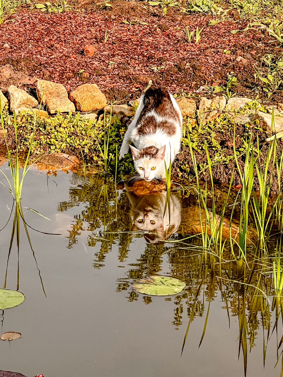 Как хорошо быть блогером с котиком! Выложил пару забавных фото своего пушистика и все! Просмотры обеспечены! А уж если еще какое смешное видео удастся записать, то вылет в космос в топ показов обеспечен. У нас же в доме жила только черепаха. Долго жила, больше 15 лет. Черепаха правда не наша, а старшего сына. Вот по этому она теперь у него и живет. Длого он своего питомца забирать не спешил, но все таки семья воссоединилась, а у меня освободился комод, на который теперь вместо аквариума можно вазу с цветами поставить. Ну так вот, про котиков. Котиков у нас в доме не живет. Зато сколько их ходит вокруг дома, мама дорогая 🙈! Несколько черных, рыжие, полосатые, пятнистые. Задают концерты и просто отдыхают в цветочках. А уж сколько соседских голубей переловили и не сосчитать. Но и вот один котик (или кошечка) пришел водички попить. А у нас в саду все продолжает меняться. Распускаются нимфеи, зацветает лаванда. Пока все скромненько, по первогодному, но дарит надежду, что уже в следующем го