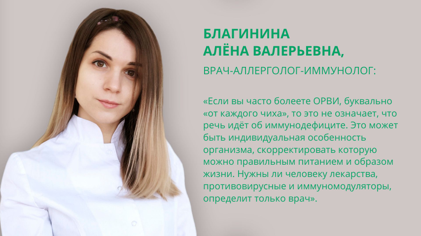 Осень и зима – сезон гриппа и простуд. Как подготовиться к натиску инфекций, рассказала аллерголог-иммунолог медицинского центра «Парацельс» Алёна Благинина. Как реже болеть? "Однако всё хорошо в меру. При злоупотреблении мытьём рук, особенно с использованием агрессивных моющих средств, можно спровоцировать развитие дерматита кистей", - предупреждает Анна Валерьевна. ТОП-3 распространённых заблуждения про ОРВИ ❌ Я болею, потому что у меня низкий иммунитет. ✅ Не обязательно. Это может быть индивидуальная особенность организма. А уровень иммунитета может определить только врач. Кроме того, причиной частых ОРВИ может быть вовсе не иммунодефицит, а наличие фонового заболевания, например аллергического или вазомоторного ринита, при которых воспалённая слизистая не может полноценно противостоять инфекции. ❌ Во всём виноваты кондиционеры. На самом деле кондиционер не может являться причиной респираторных инфекций, т.к. их вызывают вирусы, бактерии, а не холодный воздух. Однако не стоит сидеть
