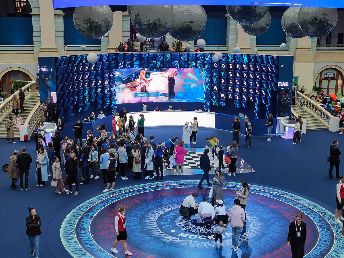 Как мне показалось, площадка Урбанистического форума в Лужниках, больше про спорт, инфраструктуру города, благоустройство. А вот площадка в Гостином дворе совсем другая. Здесь больше о здоровье, социализации, коммуникациях. На входе можно угоститься конфетами. Как раз "Москвичка" называются. В первом помещении несколько залов в которых проводят лекции. Темы общечеловеческие: как воспитывать ребенка, о здоровье, о взаимоотношениях между близкими людьми. У каждого зала расписание и темы лекций указаны. Очень необычно выполненные постеры на входе в лекционные залы. На них изображены врачи, учителя, и сделано так, что когда ты на них смотришь они смотрят на тебя и провожают взглядом и машут рукой. Очень необычно Дальше попадаем в большой зал с неоновой подсветкой. Здесь установлена шестиметровая фигура Цифрового человека. Показывает как происходит старение организма изнутри. По периметру множество залов с разными активностями. Можно узнать свой тип характера, или пройти тест какая проф