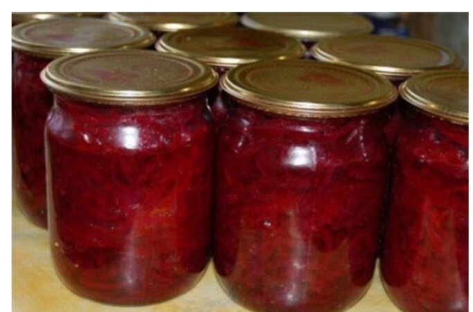 Берём 5 кг свёклы, 2 кг томатов, 3 ст. ложки соли. Свёклу пропускаем через крупную терку, томаты измельчить через мясорубку. Всё перемешать, добавить соль. Варим на медленном огне после закипания10 минут. Раскладываем в банки. И варим в автоклаве 15 минут при 110 градусах. Борщ готов.