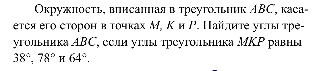 Рассмотрим треугольник АВС и вписанную в него окружность. По теореме, отрезки касательных, проведенные к окружности из одной точки, равны. Тогда, треугольники МВК, АМР и КРС являются равнобедренными, а углы при основании каждого из них равны.