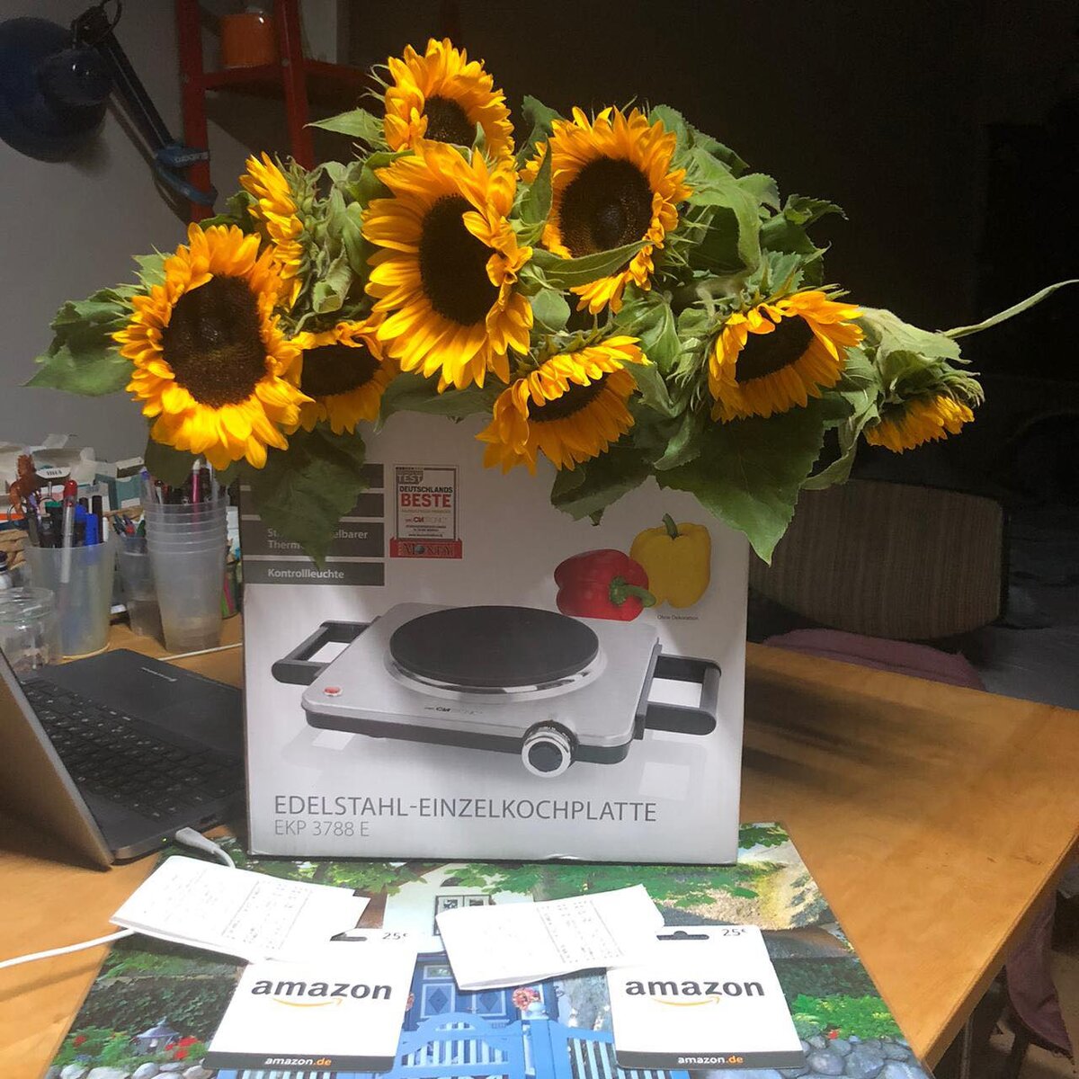 Сидю, грустю... никого не трогаю... И вдруг трах-тибидох - материализовался вот такой роскошный букетище... А от кого, не скажу... от Бабайки. А ещё у меня новая электроплитка и теперь не надо таскаться на дальний конец сквота в общую кухню. Завтра распакую, сварю борщик и буду радоваться. А внизу, на столе, два подарочных сертификата, по 25 евро каждый, для Бэкс и Шэрон - моя благодарность за их неоценимую помощь. Они смогут в Пенни - маркете купить себе что-нибудь вкусненькое или полезненькое. Девочки удивились, изумились, а Бэкс даже заплакала. Так закончился этот спокойный, на первый взгляд, день.