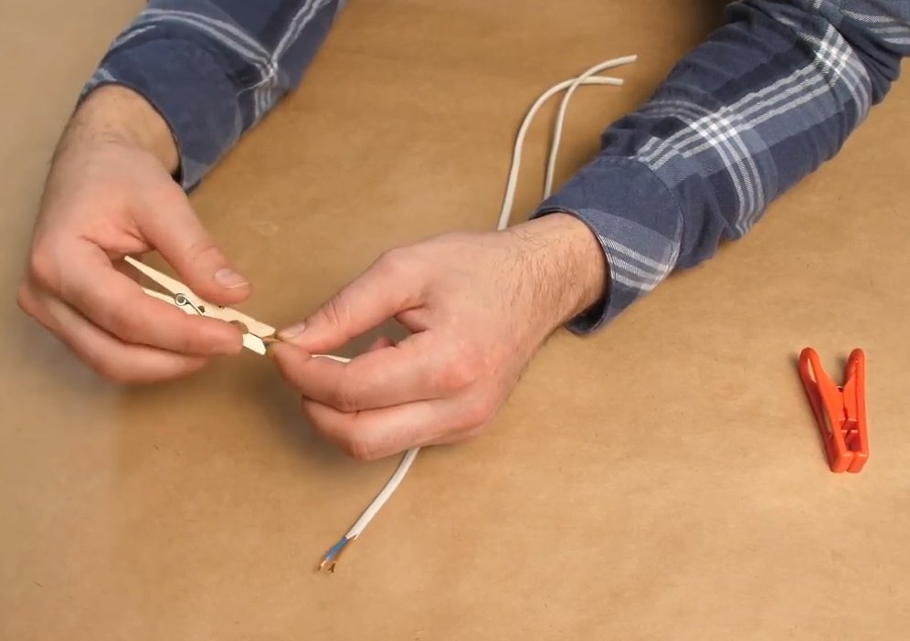 Оперативно скрутить и изолировать провода можно разными способами. Мелкие колючие провода без оплетки можно легко скрутить с помощью обычной бельевой прищепки. Просто зажмите концы проводов прищепкой и прокрутите несколько раз и все готово.