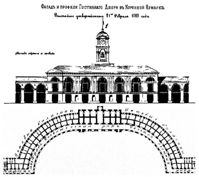 После переноса в 1878 году Коренной ярмарки (тогда она именно так называлась) в Курск, существовавшая там ярмарочная инфраструктура быстро пришла в упадок и была впоследствии утрачена. В частности, так случилось с большим Гостиным двором, выполненным в стиле классицизма к 1812 году. Автор проекта этого сооружения – знаменитый архитектор Джакомо Кваренги. Несомненно, именно Гостиный двор в начале XIX века стал организующим центром ярмарки и придал ей соответствующие размах, блеск и популярность...