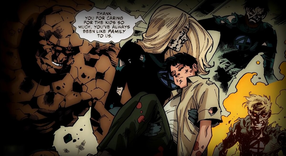 Предыдущая часть Не делай этого, прошу тебя... Я хочу сказать тебе "спасибо", Питер. Спасибо за то, что так заботишься о детях. Ты всегда был почти семьей для нас. Прошу, Сью, не надо! Но теперь у нас новая семья. Мама? - тихо проговорил очнувшийся Франклин, которого зомби-Сью держала на руках. И у тебя она тоже скоро будет. А потом Невидимая Леди укусила своего сына, заставив Человека-паука закричать от ужаса. *** Нет!!! Ааааа!!! - закричал уже взрослый Франклин, который забыл, как резко его дядя может просыпаться после ночи кошмаров. Питер извинился перед присутствующими, он не хотел никого напугать. Это был тот случай, когда ужасы прошлого его настигли, и он от этого в очередной раз ощутил свое бессилие. Головная боль накатила с новой силой, и Паркер схватился за голову. Блэйд попытался успокоить напарника, сообщив, что с детьми все в порядке. И ты только зацени этот вид. Воу. Да, действительно, вид был впечатляющим. Нана летела над Стеной Фаланги, которую Питер никогда в живую