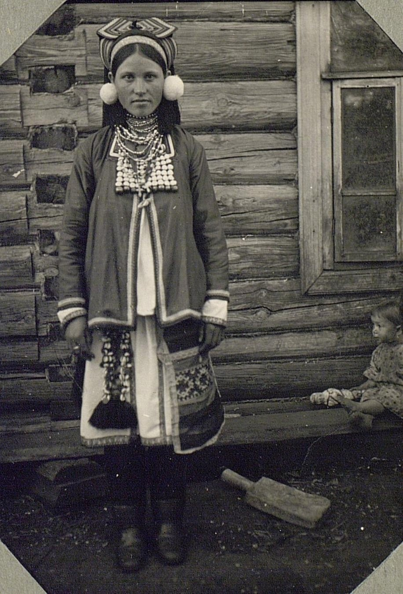 На одном сайте мне попалась архивная фотография мордовской женщины в национальном костюме. Меня поразило обилие на ней разнообразных украшений, причем среди них были не совсем обычные. Давайте поговорим сегодня о том, чем украшали себя мордовские красавицы (некоторые отличия в костюме эрзя и мокша были, но мы не будем заострять на этом внимание). Можно рассмотреть отдельно предметы, которыми украшали голову, и предметы, которыми украшали всю остальную одежду. Конечно, это серьги (мокш. пилькст, эрз. пилекст). Обычно они имели форму небольших колец из латунной или медной проволоки (встречались и серебряные) с подвесками из монет или бусин. В начале XX века носили ушные подвески в виде шариков из гусиного пуха (мокш. нармонень пух, эрз. нармунень пух), зайца (нумолонь пух — мокш., эрз.), шерсти. Эти шарики вешали на колечко серьги или при помощи нитяной петли – на мочку уха. Наряжая девушку к венцу, ее мать приговаривала: «Крестная хорошая, Подошло время тебя нарядить. На голову повязат