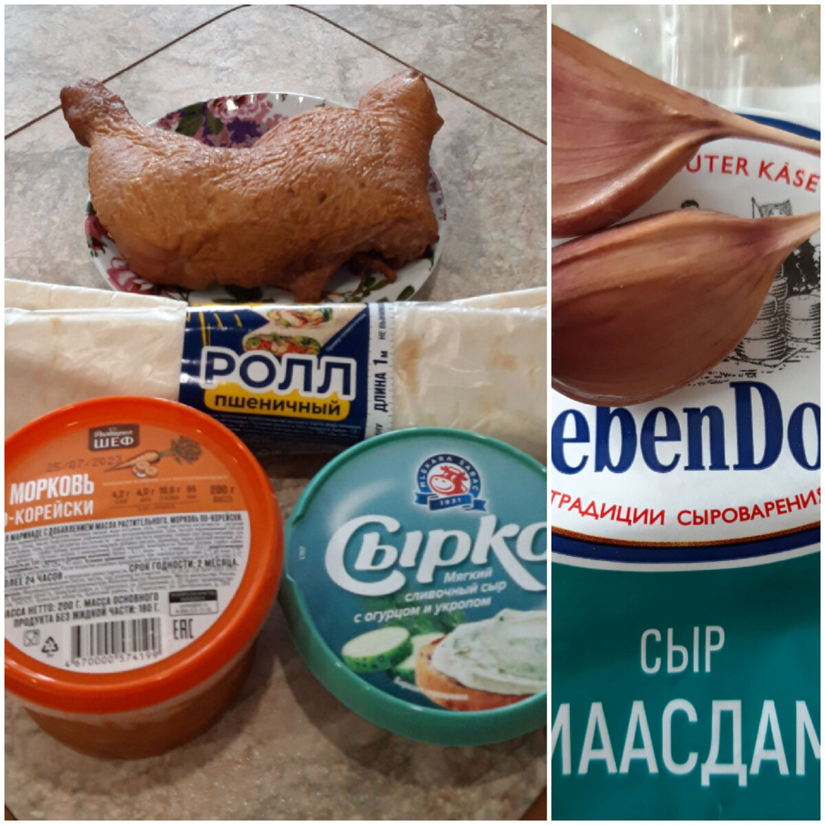 Что только не начиняют наши русские хозяюшки: и различные овощи, и мясо и мясные продукты, и рыбу, и яйца, и сыры, и колбасные и хлебобулочные изделия!.. Читая рецепты во "всемирной паутине", просто удивляюсь фантазии, воображению и виртуозности наших женщин! А какое разнообразие и обилие начинок! И, конечно же, королём всей этой феерии является тонкий лаваш! Я сегодня пробую приготовить новую начинку для тонкого лаваша. Только я беру не лаваш, а пшеничный ролл. Очень практичный и экономичный продукт: ролл удобнее заворачивать и от него меньше отходов. Итак, вот список продуктов, которые нам понадобятся: 1 пшеничный ролл; 200 гр моркови по-корейски; 100 гр мягкого сливочного сыра (у меня с солёными огурчиками и зеленью); 50 гр твёрдого сыра (у меня "Маасдам"); 1 копчёный куриный окорочок; 2 зубчика чеснока, укроп; 1 ст.л. майонеза. Приступаю к осуществлению своей задумки: Теперь аккуратно острым ножом нарезаем наш ролл на порционные куски и лопаем с аппетитом! Начинка получилась сочна