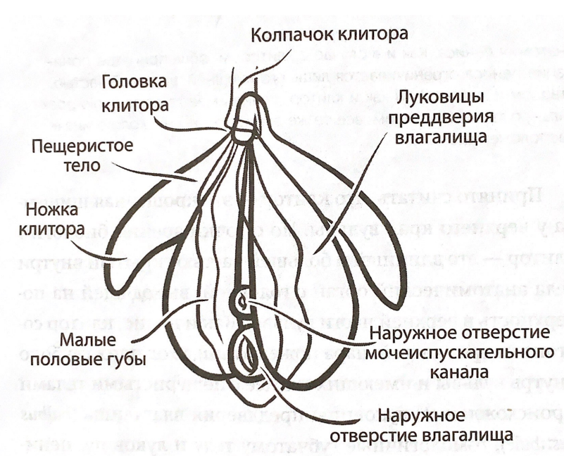 Немного анатомии или СХОДСТВО И РАЗЛИЧИЯ КЛИТОРА И ПЕНИСА. Вся внешняя часть женских гениталий называется “вульва”. Под словом “вагина” имеют в виду внутренний репродуктивный канал, ведущий к матке. Люди нередко говорят “вагина”, подразумевая вульву. Важно понимать разницу. Клитор и пенис- органы внешних гениталий, и в них сосредоточена масса нервных окончаний. Видимая часть клитора, или его головка, находится на самом верху, на небольшом расстоянии от вагины. Клитор - наш “главный штаб” эротических ощущений. Будучи в длину не больше одной восьмой от пениса, он содержит почти вдвое больше нервных окончаний. По размеру клитор может быть и с горошину, и с крошечный огурчик- любая версия нормальна и прекрасна. У пениса четыре функции: ощущения, проникновение, эякуляция, мочеиспускание. В отличие от пениса, клитор отвечает только за ощущения. Видимая часть клитора - только его головка. Также и похожая на желудь самая верхняя часть пениса - это только его головка. Многие знают, что у ствола