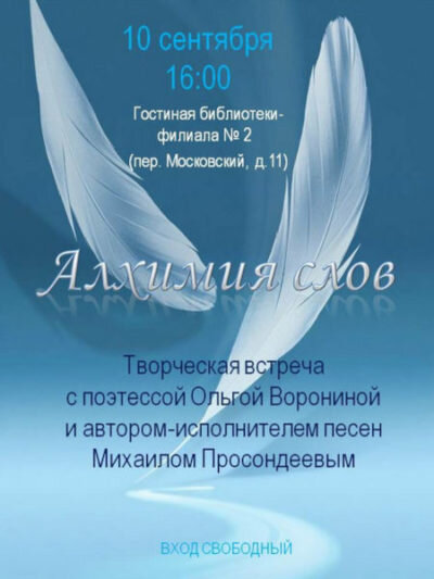 В воскресенье, 10 сентября, в гостиной библиотеки — филиала № 2 (пер. Московский, д.11) состоится творческая встреча с автором-исполнителем песен Михаилом Просондеевым и поэтессой, членом литературного объединения «Родник» Ольгой Ворониной. Начало в 16 часов. Вход свободный.