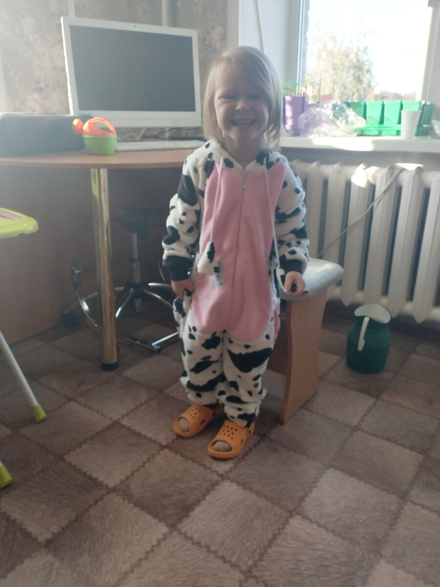 Вообще изначально идею покупки кигуруми я рассматривала как бредовую. Потому что я являюсь адептом одежды из натуральных материалов. И искренне не понимала, зачем запихивать себя в недышаший мешок. А потом случилось вот что. Посмотрев несколько раз мультики по ТВ, Люба подошла ко мне, подмигивая одним глазом, и попросила Сову Дормео, такую же, с прищуром, жертва рекламы, блин. Я посмотрела на Вайлдберриз, о боже мой, они стоят две с лишним тыщи. Стала искать замену, но потом убедилась, что аналоги в два раза дешевле совсем никакие по качеству. Грязные, драные и кривые. И тут меня осенило, зачем игрушка с пледом, если можно совместить, купить сову кигуруми. Ведь они такие мягкие. Стала смотреть, но опять же, везде дырявый, неаккуратный и грязный Китай. Искала-искала, но наконец наткнулась на русский кигуруми, отличный по качеству. Правда, это не сова, а корова. Но зато, мягкий, плюшевый и аккуратно сшитый. Люба оценила. А у меня перестала болеть голова, во что одеть ребенка, пока не вк