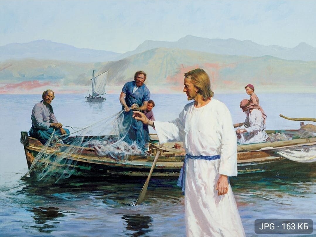 "Он же сказал им: закиньте сеть по правую сторону лодки, и поймаете. Они закинули, и уже не могли вытащить сети от множества рыбы."