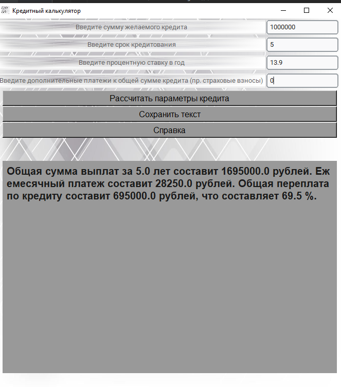 В этот раз я решил написать какую-нибудь полезную программу на питоне. В качестве таковой был выбран кредитный калькулятор. Логика программы будет достаточно простой. Пользователь вводит следующие значения: сумма кредита; срок кредитования; процентная ставка; сумма дополнительных платежей (страховки и т д). На выходе пользователь получает значение ежемесячных платежей и суммы переплаты по процентам и т д. Итак, для начала определимся с каким модулем мы будем строить интерфейс. Выбор пал на tkinter и customtkinter. В качестве декорации фона будет задействован модуль pillow. Вся программа уместится в один класс Main(Frame). Создадим функцию инициации. Здесь мы прописали логотип-подложку в виде изображения темной темы customtkinter, а также прописали размеры этой подложки. Изображение будет расположено в лейбле с заданными параметрами смещения по строкам и столбцам. Далее пропишем элементы интерфейса в функции build. В качестве элемента для вывода информации по кредитному расчету выступи