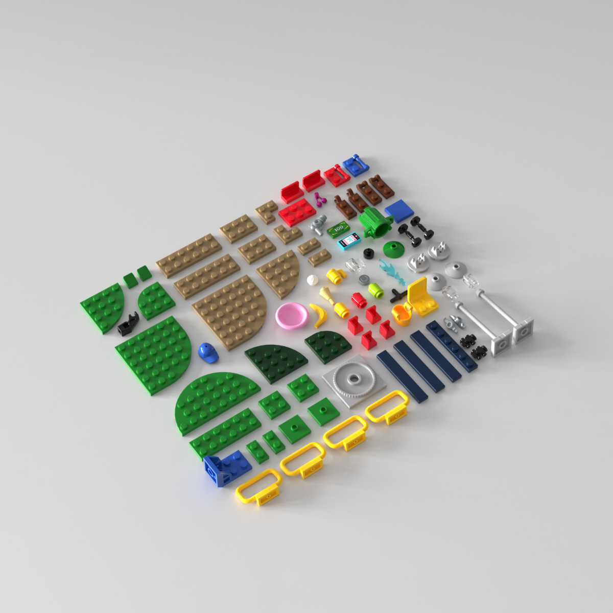 Благодаря LEGO, каждый может сделать свой собственный парк – даже если он ландшафтный дизайнер по образованию. А что нужно для создания парка? Много рабочих, строительная техника, несколько месяцев упорной работы… или же просто набор деталей для создания парка от Куботеки! Или не только парка - у нас есть комплекты на самый разный вкус и цвет. В нашем наборе для строительства городского парка есть всё, что нужно для полноценного творчества: детали фонарей, мусорный бак, куча пластин, ограждений и аксессуаров, включая банан и смартфон. Ваш парк – ваша планировка! Мы очень ответственно подходим к выбору деталей для наших наборов. Наши дизайнеры тщательно выбирают каждый элемент, его цвет и количество. Все для того, чтобы вы могли реализовывать ваши собственные ЛЕГО-проекты так, как хочется именно вам! Набор с парком не стал исключением: например, из уже имеющихся в наборе элементов можно собрать карусель. А если есть достаточно деталей в собственной коллекции, можно расширить планировку,