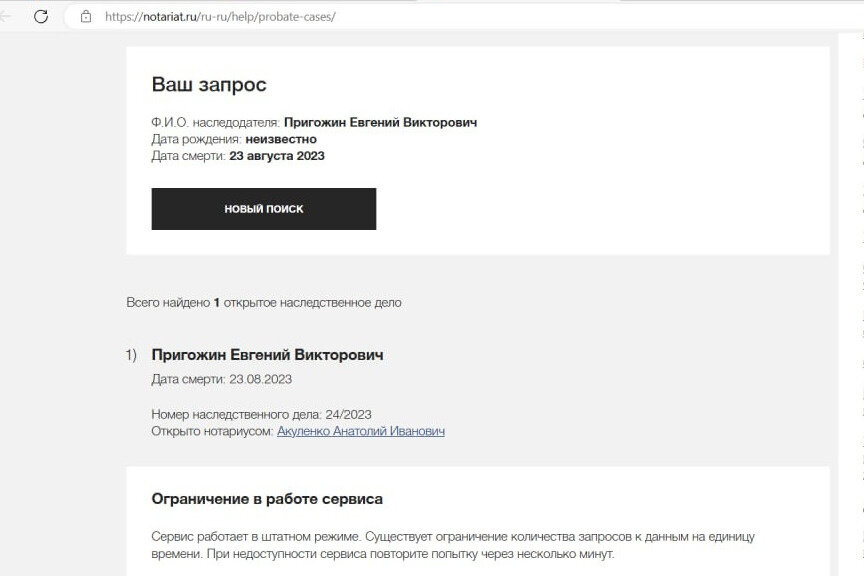 Федеральный реестр наследственных дел пополнился карточкой с именем Евгения Викторовича Пригожина, который скончался в тот же день, что и владелец ЧВК «Вагнер». Читайте на "Фонтанке"