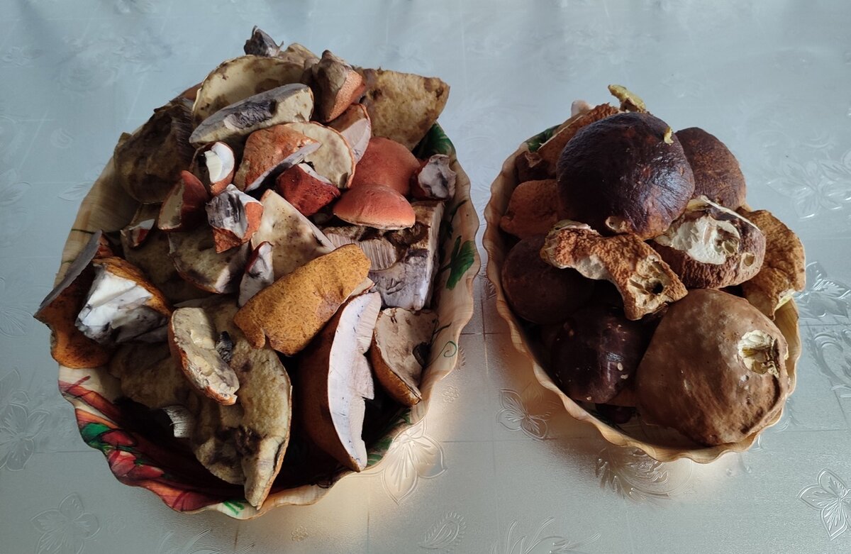 После чистки у меня получилось вот столько подосиновиков и белых. Я хотела посушить грибы на нитках, но... Передумала. А знаете почему?) Мне некуда было бы вешать эти нитки. Вот такая засада) В моей квартире все стены каменные и гвоздик не вобьёшь просто так.
