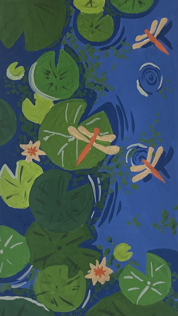 Намечаем рисунок. Воду делаем двух оттенков, чтобы передам свет и тени. Также разными оттенками зеленого рисуем листья кувшинок. Рисуем прожилки белыми и болотными красками. Вокруг зелени добавляем точки таких же цветов. Делаем кувшинки и стрекоз с помощью двух цветов: бежевого и рыжего.
