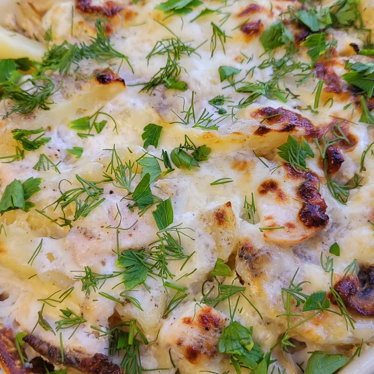 Как быстро, а главное вкусно накормить всю семью. Сейчас расскажу. А еще это блюдо не навредит Вашей фигуре. Кто придерживается правильно питания, можете смело готовить его. Давайте приступим. И Нам потребуется 500 гр. Картофеля 500 гр. Грудки 500 гр. Шампиньонов 2 яйца 5 ст. л. Сметаны 100 гр. Сыра Соль, перец и специи по вкусу Зелень Наризаем крупно картофель, берём глубокую форму для запекания и складываем его туда. Форму, я немного смазала подсолнечным маслом. Также в форму отправляю нарезанную грудку и шампиньоны. И всё хорошо перемешиваю. Теперь приготовим заливку, для нашего блюда. И для этого смешаем яйца, сметану и сыр. После заливаем блюдо яично-сметанной смесью. И отправляем в духовку на один час при самом медленном огне. Час спустя блюдо готово, посыпаем любимой зеленью, у меня это смесь укропа и петрушки. Раскладываем по тарелочкам и радуем своих домочадцев. Блюдо получается очень вкусным, надеюсь Вы оцените. А если понравился рецепт простого блюда для всей с