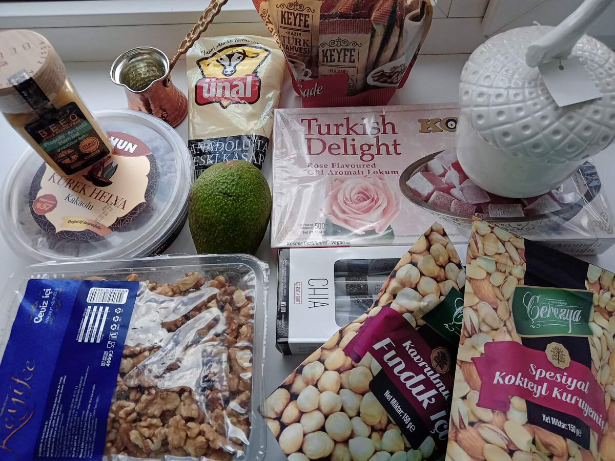 Я нередко летаю из Турецкой Республики и, конечно, всегда привожу подарки. В общем-то, стандартный, так сказать, сувенирный набор путешественника из Турции в моей сумке всегда более или менее выдерживается: это лукум, халва из кунжута, орехи, оливковое масло, чай, может быть сыр, пахлава, бастурма, мёд... Помимо гастрономических наименований, в моём багаже можно часто обнаружить поделки с национальным колоритом, сувенирчики и более практичные вещи: турецкую колонью, необычную посуду, интерьерные украшения, конечно же, знаменитый турецкий текстиль... Всё это я привожу в качестве гостинцев и подарков семье, знакомым, друзьям... А часто и себе - на память о приятном времени.