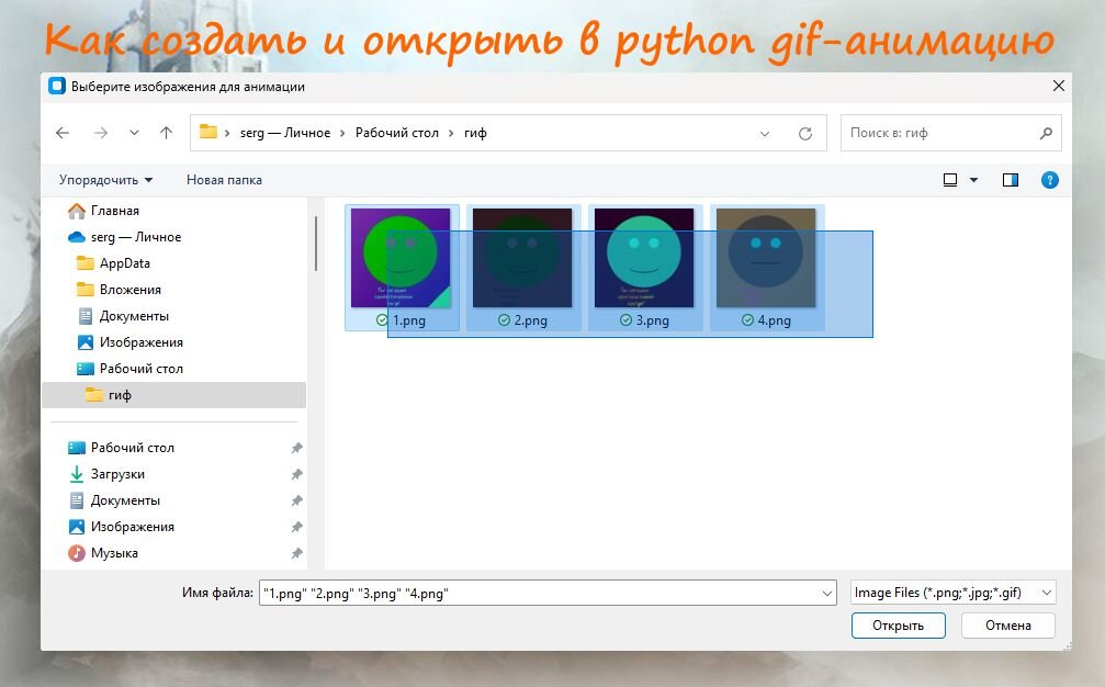 Рассмотрим пример кода на Python, с использованием библиотеки customtkinter, для создания и открытия gif–анимации из нескольких изображений, загружаемых через диалоговое окно: Этот код открывает окно файл-диалога tkinter, где пользователь может выбрать несколько изображений для создания анимации. Затем он использует библиотеку Pillow (PIL) для создания gif–анимации с помощью метода `save` класса `Image`. Обратите внимание, что вам может понадобиться установить библиотеки customtkinter, tkinter и Pillow, если они еще не установлены. Вы можете установить их, используя pip командой: pip install tkinter Pillow customtkinter Итак, гифку сделали. Теперь ее необходимо открыть в некоей python–программе. Для открытия GIF-анимации в окне программы Python можно использовать все ту же библиотеку customtkinter. Вот код: Если ваш файл анимации называется `animation.gif` и находится в той же папке, что и ваш скрипт Python, то он будет отображаться в окне программы. А вот и сама анимация. Текстовый ко
