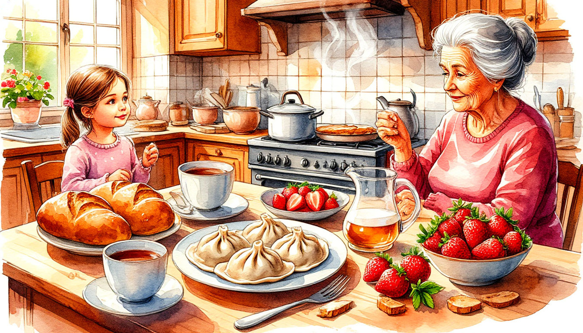На даче она просыпалась под звуки кухни: дедушка помешивал манку, бабушка шуршала оладушками. Её детство началось с запахов — и эти запахи до сих пор живут где-то глубоко в памяти.