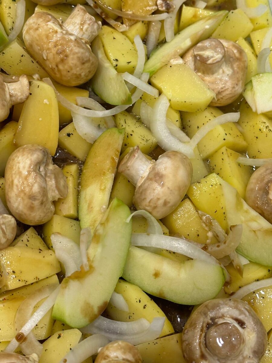 В далеком 2020 году, сидя на карантине, я (позволю себе вольность) изобрела рецепт гарнира. Его можно к мясу/курице/рыбе в любом виде, который покажется вам уместным. Я больше всего люблю сочетание «картошка + курица», но вместо обычной печеной картошки нравится именно этот вариант. ❗️Внимание, шок: моя бабушка – гуру готовки, пользуется моим изобретением 😎 Значит, нам нужно: картофель (примерно 5 штук среднего размера), небольшая луковица, яблоко, шампиньоны (250 грамм), соевый соус, растительное масло, прованские травы (обязательно). Берем две глубокие тарелки👇🏼 1 тарелка: картофель режем дольками как по-деревенски в маке, совсем немного солим и перчим, добавляем прованские травы. Далее очень важный шаг❗️Поливаем дольки растительным маслом и перемешиваем, чтобы каждая картофелинка стала масляной. Теперь тарелка просто стоит и ждет дальнейшего развития ее судьбы. 2 тарелка: шампиньоны целые хорошо промываем, поливаем соевым соусом, даем минут 10 настояться. Для сочности каждый гриб