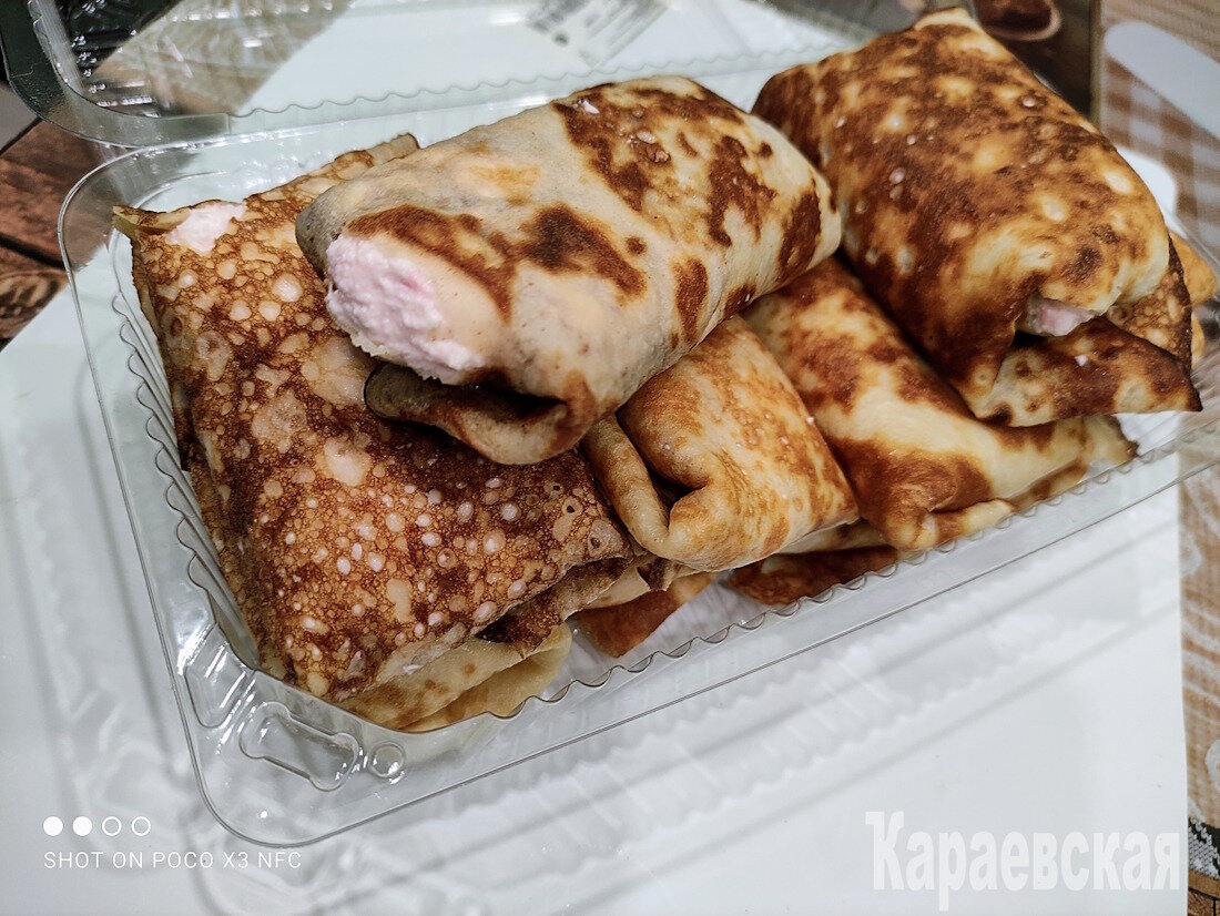 На каждый блин выложить немного начинки и свернуть конвертиком.