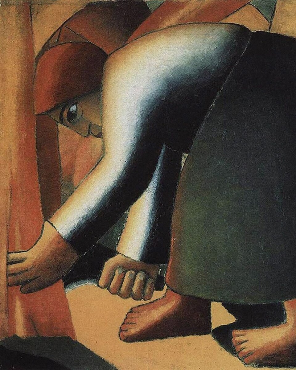 В 1910-х годах полотна Малевича впервые наполняются фигурами крестьян, занятых работой. Они примитивистски упрощены и укрупнены, иконописны по цвету и плоскостности. Для художника это возвышенные и прекрасные герои. Грубо вырубленные головы, мощные тела, монументальная застылость. Их лица ещё явно хранят воспоминания о церковных ликах.