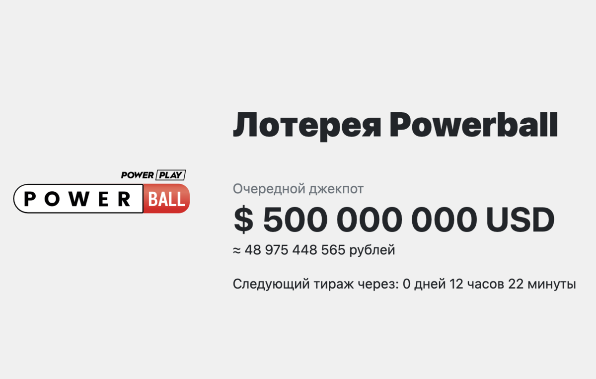 Powerball - суперзвезда среди американских супер-лотерей. В ноябре 2022 года был побит рекорд и выигрыш составил 2,04 миллиарда долларов. В январе 2016 года джекпот достиг 1,586 миллиарда долларов. Джекпот выиграли сразу 3 участника лотереи. В розыгрыше Powerball участвуют 69 обычных и 26 специальных шаров. Чтобы выиграть джекпот нужно угадать 5 обычных и 1 специальный шар. Вероятность выиграть джекпот в Powerball составляет 1 : 292 201 338. Немного ститистики: Динамика изменения джекпота С 02.10.2016 года джекпот Powerball был разыгран 47 раз, в последний раз суперприз игры в размере $1000 миллионов долларов был разыгран 20.07.2023. В среднем джекпот разыгрывается 1 раз в 52.7 дней. Периодичность выпадения номеров За последние 831 тиражей лотереи Powerball шары с номерами 61, 21, 36, 32, 63 выпадали чаще остальных, каждые 10-11 тиражей. Шары с номерами 59, 56, 29, 52, 31 не выпадали уже 62, 44, 39, 34, 28 тиражей соответственно. Как выглядят билеты Powerball? Подробная статистика и ан