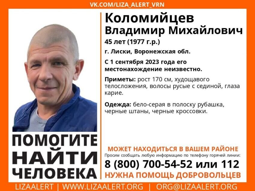 Волонтеры регионального отделения поисково-спасательного отряда «Лиза Алерт» объявили о поисках 45-летнего жителя Лисок Владимира Коломийцева, который бесследно исчез еще 1 сентября. Вот уже 9 дней мужчина не выходит на связь с родными и близкими, его местонахождение не известно. Родственники пропавшего мужчины уверяют, что ранее Владимир никогда не пропадал. Согласно ориентировке, опубликованной ПСО «Лиза Алерт», пропавший имеет не высокий рост (170 см), карие глаза и русые с проседью волосы. В момент исчезновения на Владимире была бело-серая рубашка в полоску, черные штаны и того же цвета кроссовки. Всех, кому что-либо известно о местонахождении пропавшего мужчины, просят сообщить об этому в службу спасения по номеру 112, либо волонтерам: 8(800) 700-54-52. Марина Хоружая, Фото: региональное отделение ПСО «Лиза Алерт»