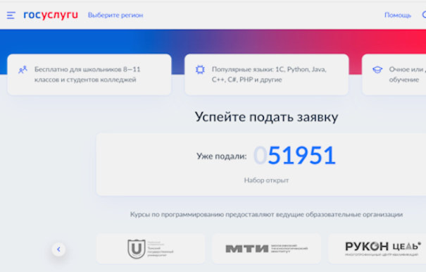 На портале ГОСУСЛУГИ идет запись школьников старших классов на бесплатные курсы программирования по государственному проекту обучения «Код будущего» на 2023 - 2024 учебный год.