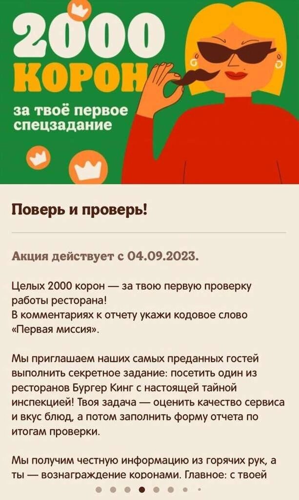 «Burger King» запустили свою программу тайных покупателей и начисляют каждому желающему по 2000 корон за проверку сети своих заведений. Нужно зарегистрироваться в приложении, выбрать ресторан и дату, прийти, поесть и написать развернутый отзыв