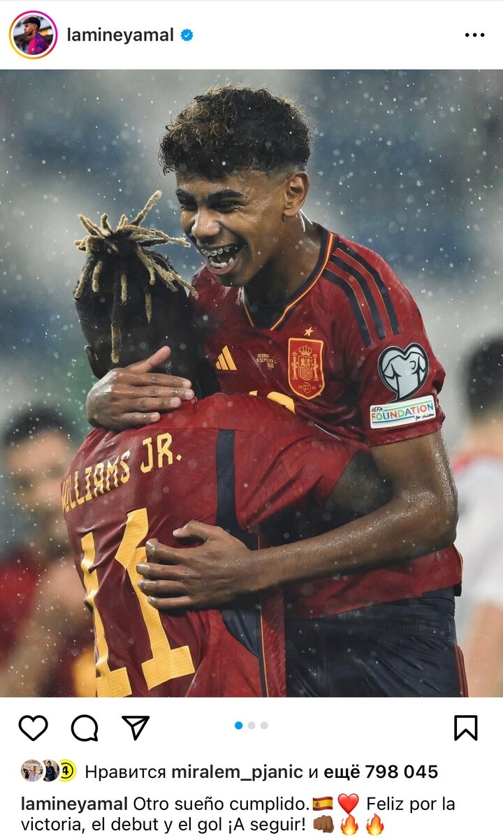 В матче против Грузии Ламин Ямаль стал самым молодым автором гола в истории сборной Испании. 16-летний футболист отличился на 74-й минуте встречи, а забить ему помог Уильямс. После матча Ламин в интервью отметил заслуги товарища по команде: «Нико все подготовил. Он оставил меня один на один с вратарем, и я просто ударил так, как подсказывала мне интуиция. Вот и все». Разумеется, полузащитник «Барсы» был обязан опубликовать в своих соцсетях фото со столь запоминающегося вечера! Ламин выбрал фотографию с Уильямсом, подпись к посту гласит: «Еще одна мечта сбылась. Рад победе, дебюту и голу. Вперед!» Публикацией парня остались недовольны Бальде и Уильямс. 20-летний Алекс и 21-летний Нико устроили 16-летнему Ламину дедовщину. Бальде обратился к Уильямсу в комментариях под публикацией Ямаля: «Ты помогаешь ему забить свой первый гол за основу сборной, а он тебя даже не отмечает [на фото в соцсетях]...» Нико подыграл товарищу: «Он не уважает своего отца». Ламин прислушался к совету старших тов