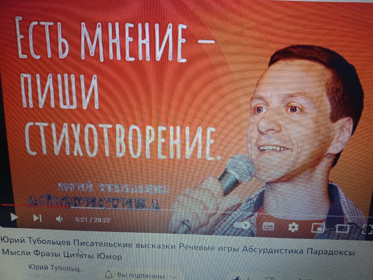Я уже писал, что на творческих вечерах можно выступать и с песнями, и с игрой на инструментах, и со стихами, и с танцами, и даже с мини-спектаклями минут на 5-7. Но очень интересен такой вид выступления, как чтение афоризмов, которые создал сам автор. Это, в какой-то степени, смесь литературного и эстрадно-разговорного жанра. А также смесь поэзии и стэнд-апа в какой-то степени!)))Что-то в этом есть, согласитесь?))))) Особенно в этом жанре преуспел широко известный в узких кругах (хотя, как сказать, "в узких"...) ЮРИЙ ТУБОЛЬЦЕВ https://vk.com/oforizmi - писатель, член Московского Союза Литераторов и Московского Клуба Афористики. Он является "гвоздем программы" любого творческого вечера. В своих выступлениях блестяще сочетает как юмористические афоризмы (от которых смеется весь зал), так и философские (от которых повиснет серьезное и задумчивое молчание в воздухе). Большинство из этих афоризмов короткие и состоят всего из 1 предложения, каждое из которых чаще всего не превышает 10