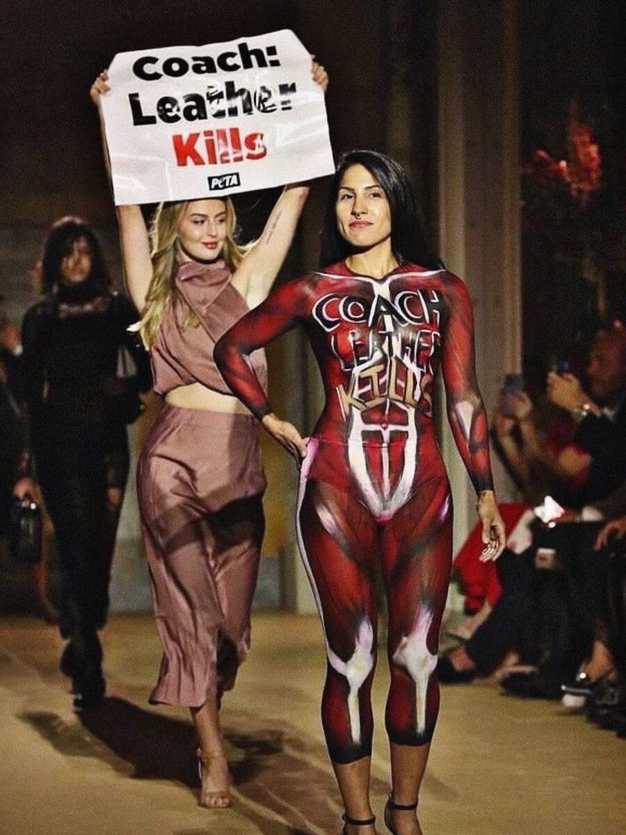 Одним из первых на недели моды свою новую коллекцию решил показать американский бренд COACH. Всё внимание к бренду базируется именно на вещах из кожи: сумках, куртках, обуви. С чем же связано такое внимание общественности? В УЖАСНОМ обращении с животными. С коров и быков снимают кожу прямо наживую, без обезболивающих или усыпляющих средств. А также, бренд использует электро-шокеры. Это всё вызывает нестерпимую боль у животных, что в современных реалиях считается почти что преступлением. И вот, 7 сентября, во время показа новой коллекции бренда coach, на подиум вышла девушка эко-активистка, которая была одета в костюм коровы, с которой только что «содрали шкуру» и надписью «coach-кожа убивает». Следом за ней, на подиум вышла вторая девушка с плакатом, на котором была такая же надпись. Девушек задержали и удалили с показа буквально через 15 секунд. Безусловно, срывать показ такими выходками это некрасиво, но таким образом они смогли обратить внимание общественности к этой проблеме.
